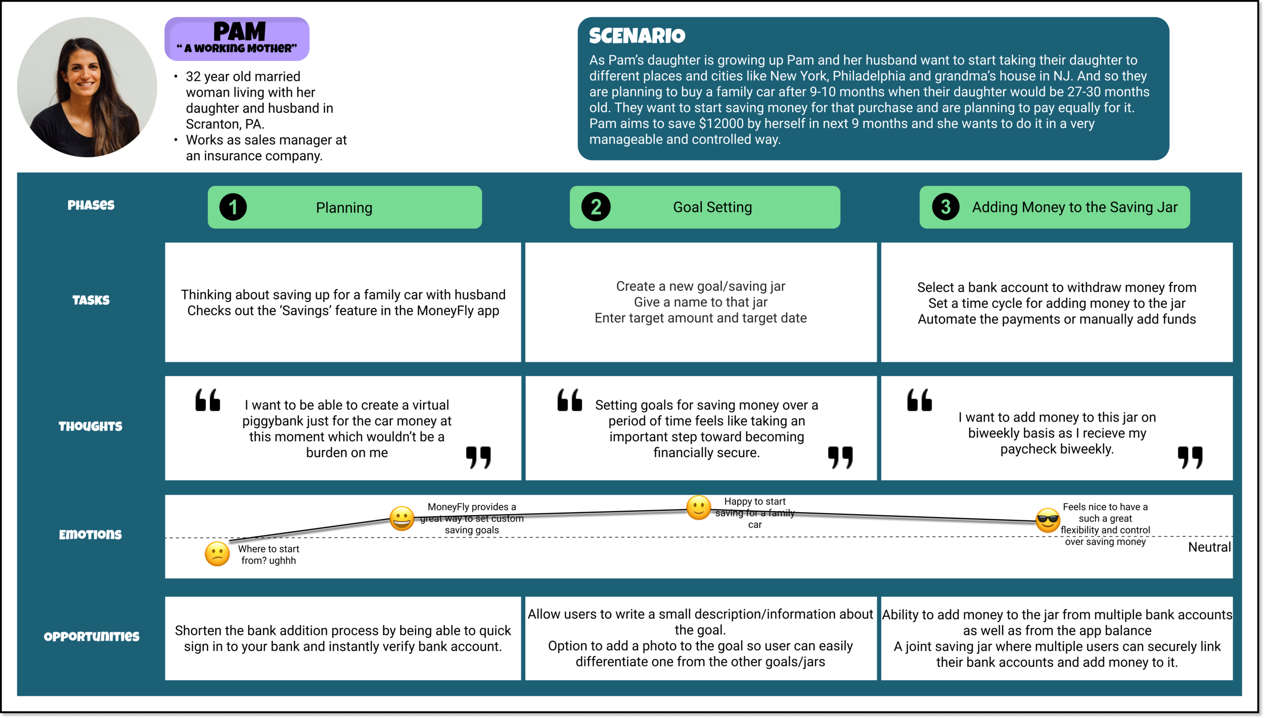 User journey maps were created as narrative documents to display the process Annie and Pam would walk through as they complete a task within the app. These journey maps show Annie’s process as she sends money to her brother on receiving the money request and Pam’s process of planning and setting up a goal to save up money for a family car.